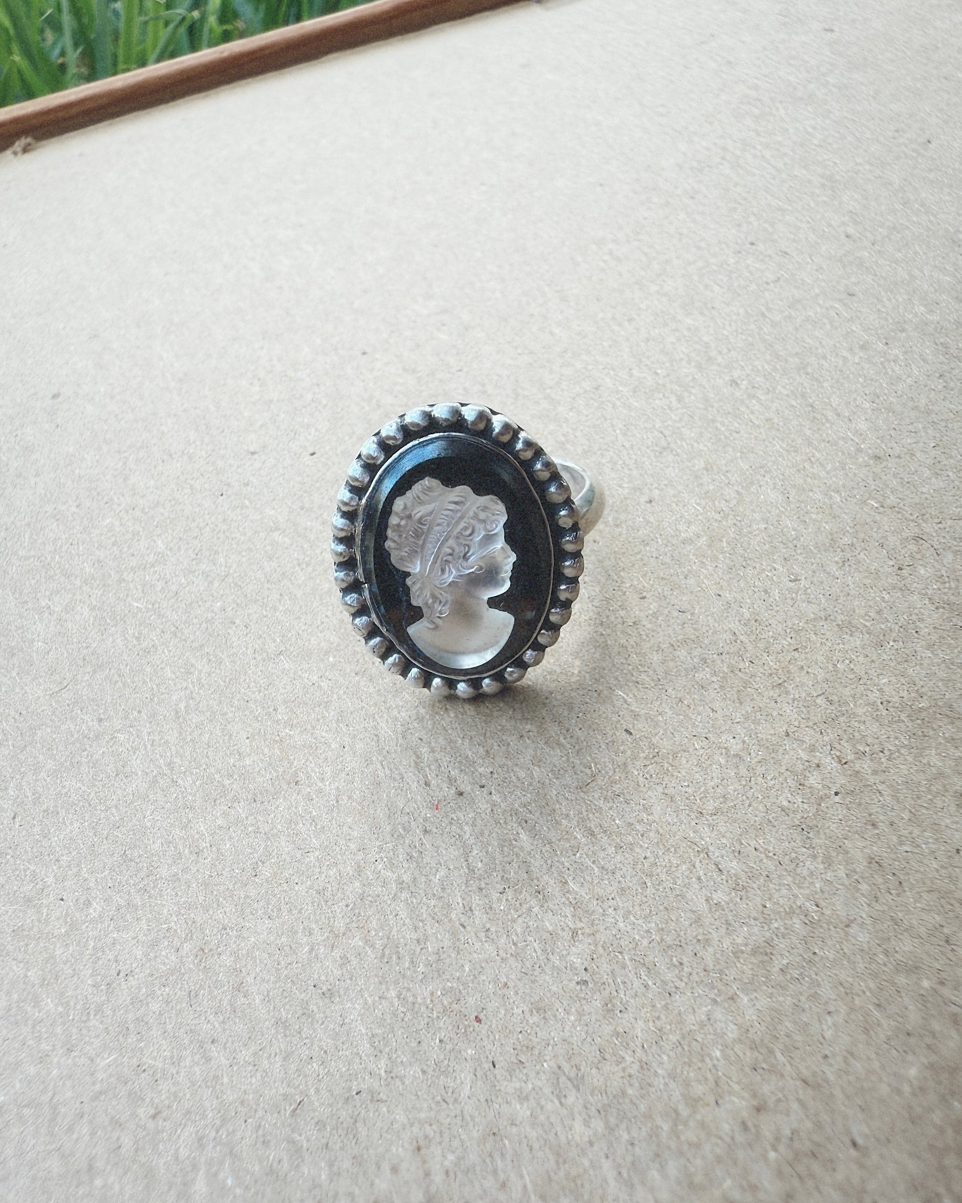 Add a touch of vintage charm to your style with The Olive Ring. This stunning piece features a beautiful antique portrait cabochon set in sterling silver. The chunky adjustable sterling silver band ensures a perfect fit for any finger. Elevate any outfit with this unique and eye-catching ring.