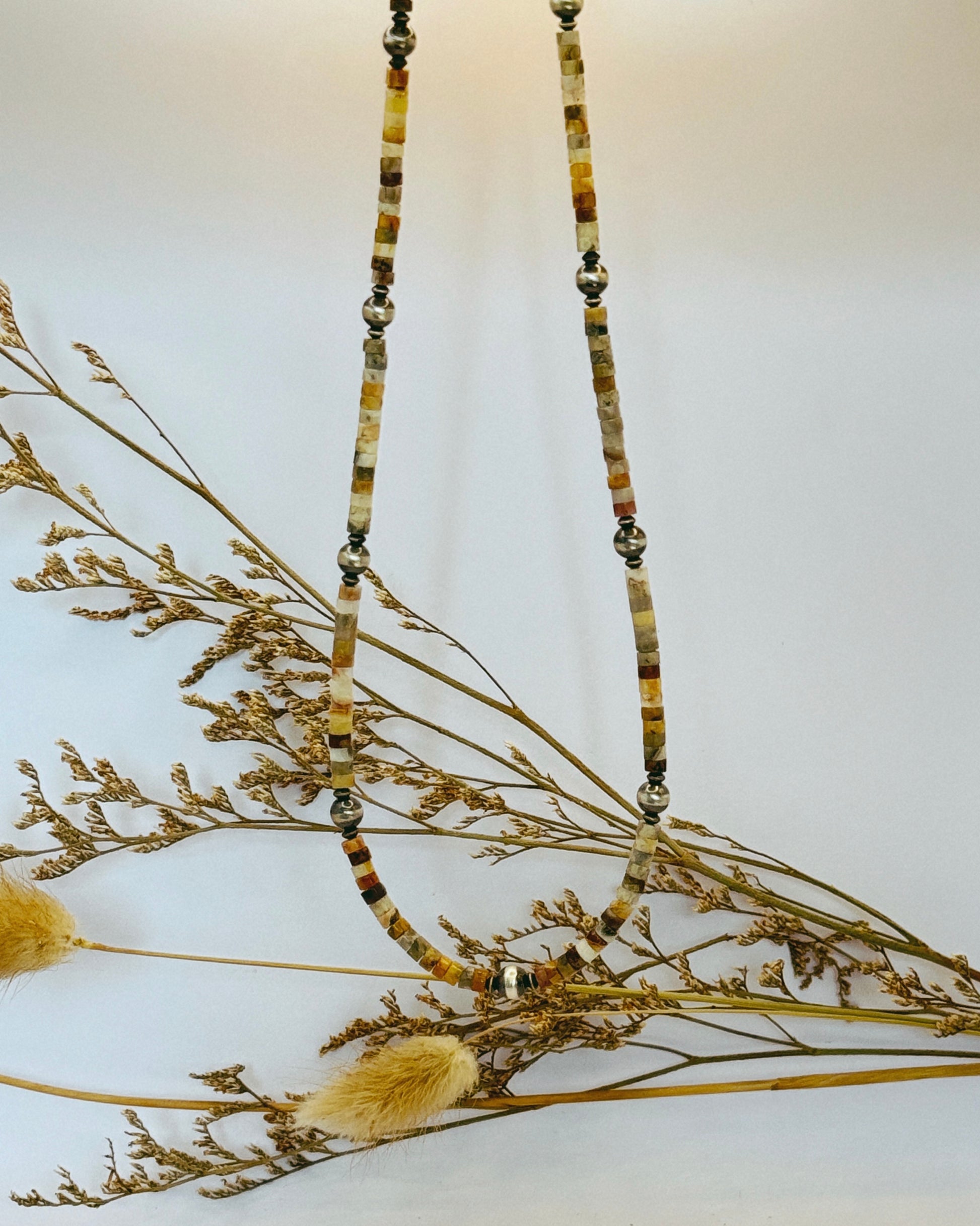 Elevate your outfit with The Prairie Necklace. This handmade beaded necklace features gorgeous jasper and sterling silver pearls, adding a touch of elegance to any look. Measuring at 19 inches, it's the perfect length for a subtle yet eye-catching accessory. Dress up any outfit with this versatile and luxurious necklace.