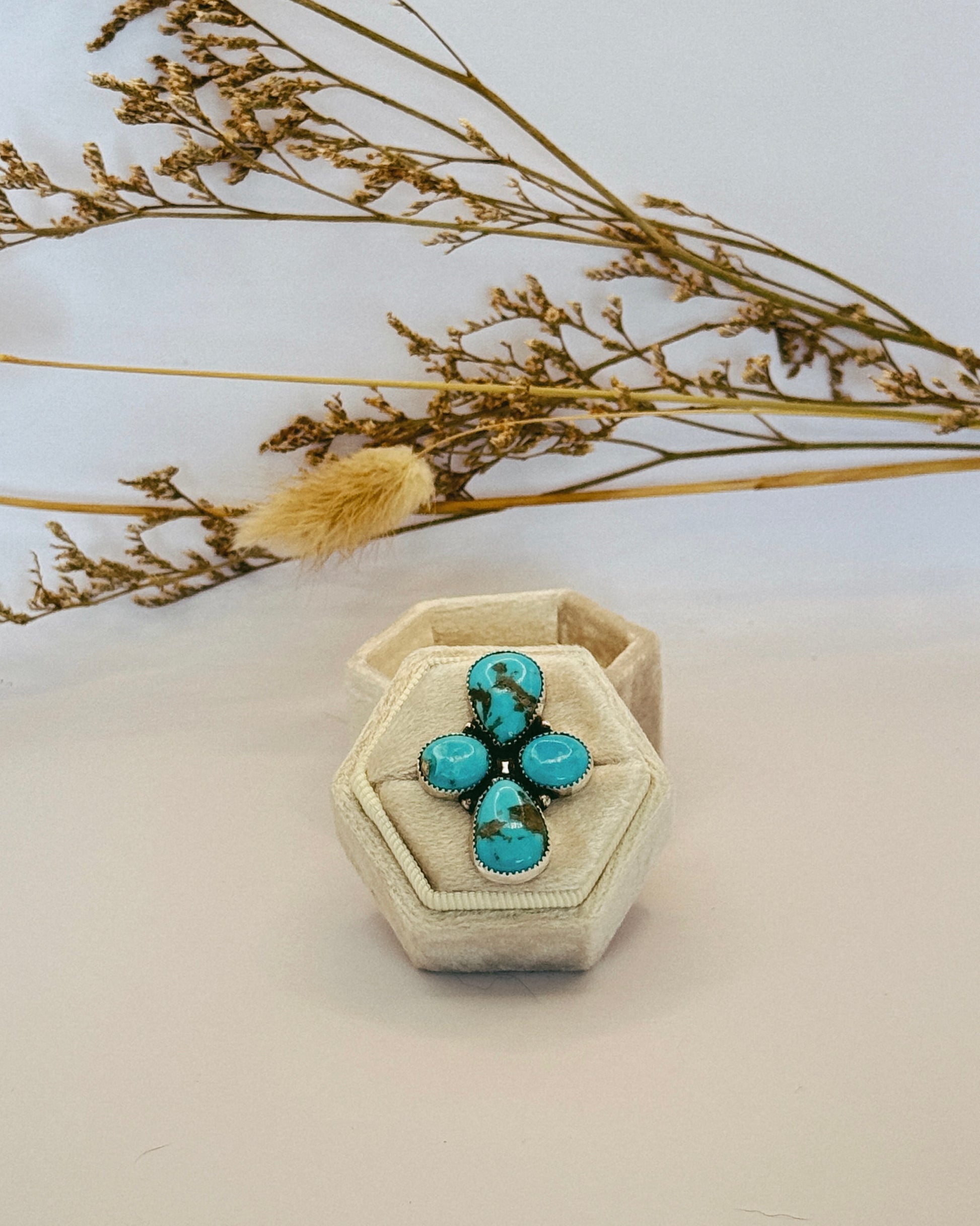 Introducing The Scout Ring - a stunning turquoise ring that can be easily adjusted to fit any finger size. This beautiful piece features 4 stones, adding a touch of elegance to any outfit. Perfect for everyday wear or special occasions, The Scout Ring is a must-have accessory.